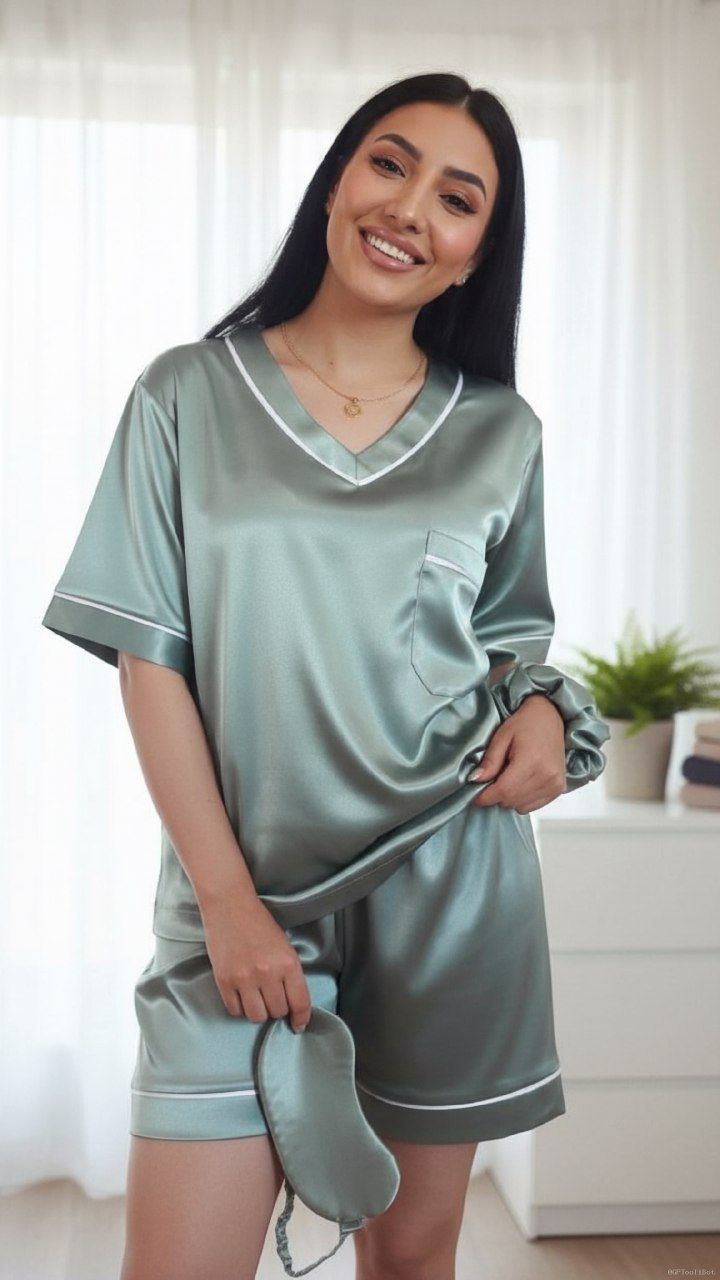 052 - ست تیشرت و شلوارک ساتن زنانه | نرم، سبک و براق