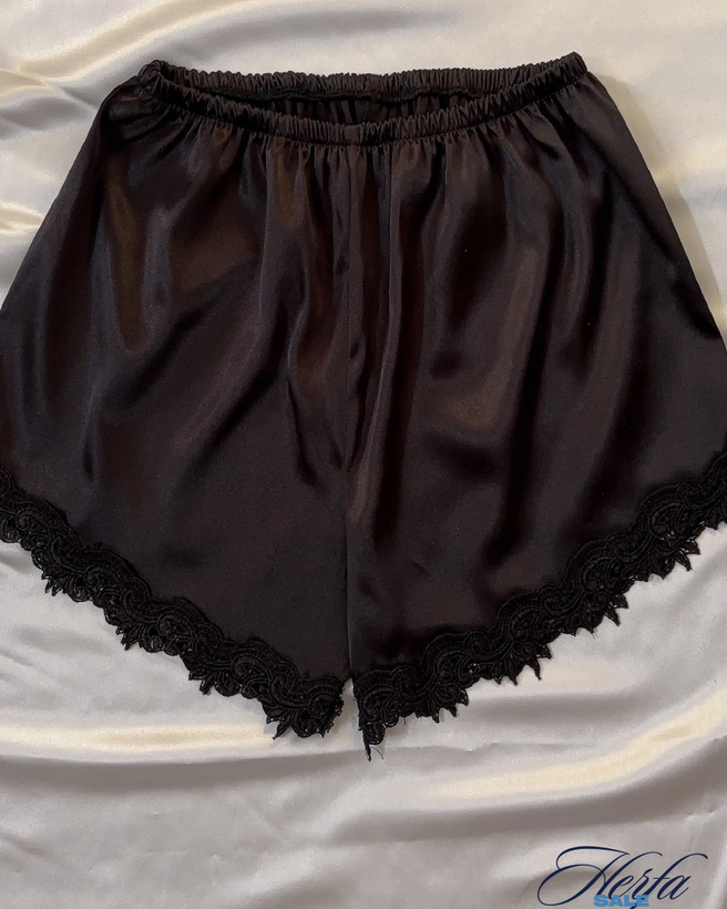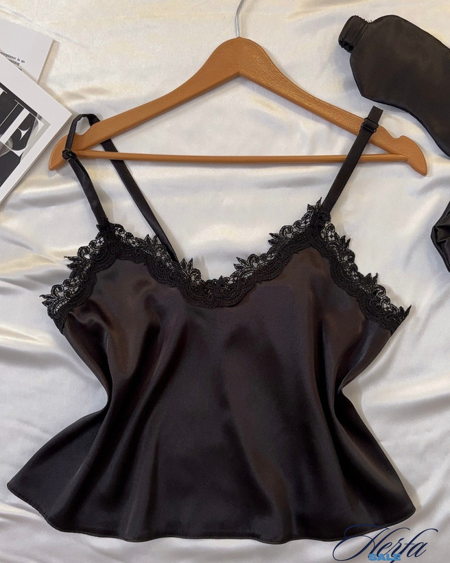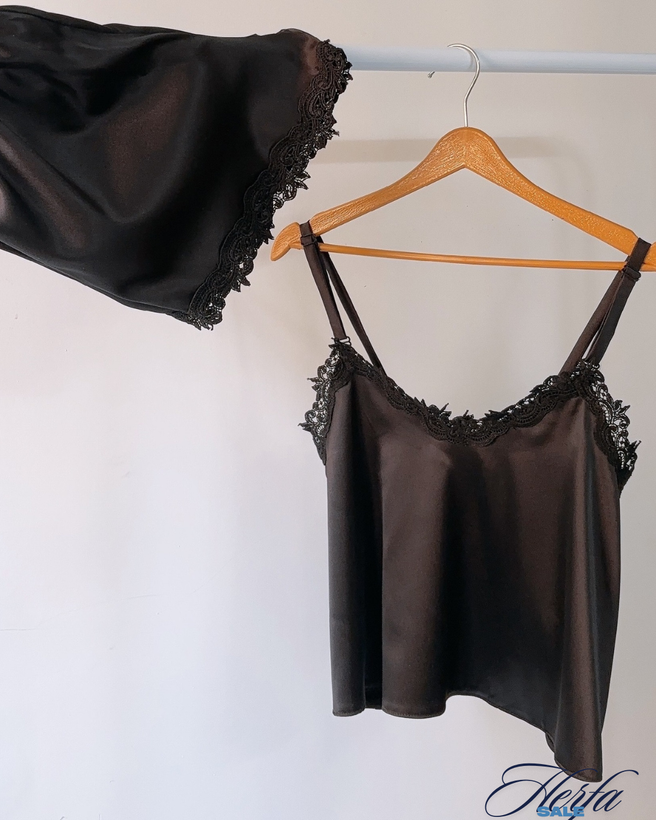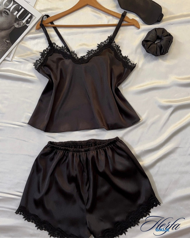 "ست تاپ و شلوارک ساتن مشکی با طراحی گیپور"