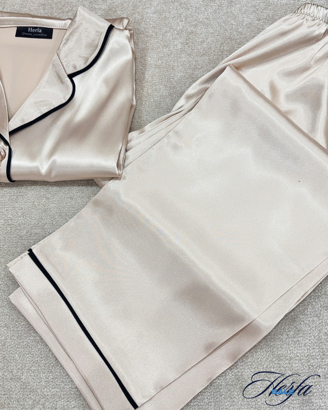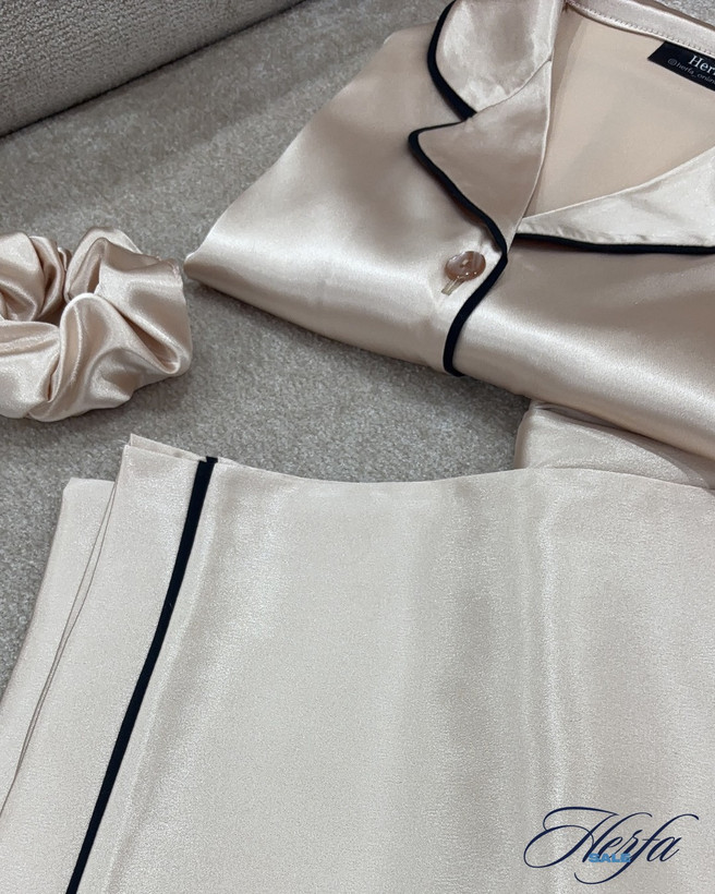 ست بلوز و شلوار کرم از پارچهی ساتن براق و لطیف تهیه شده و طراحی کلاسیک دکمهدار آن با نوار مشکی ظریف، ظاهری شیک و جذاب ایجاد کرده است. این محصول مناسب فصلهای گرم سال است و با داشتن کش در شلوار، آزادی حرکت را برای شما فراهم میکند.