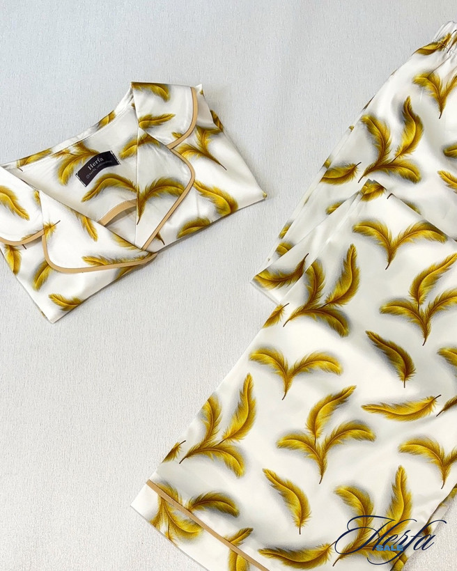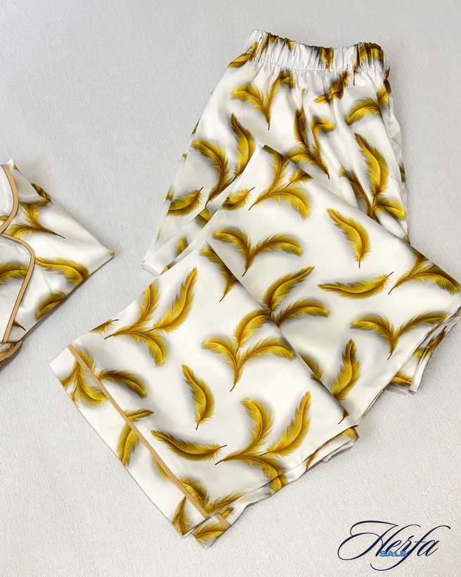 ست لباس خواب ساتن مدل Golden Feather با پارچهای لطیف و طرح پرهای طلایی، انتخابی زیبا و راحت برای خانمهایی است که به استایل خواب خود اهمیت میدهند. طراحی کلاسیک دکمهدار، آستین کوتاه و شلوار راحت با مغزیدوزی دقیق، ظاهری شیک و خاص به شما میبخشد.