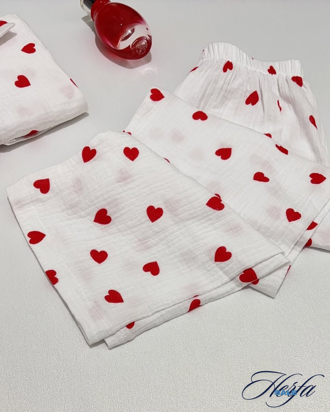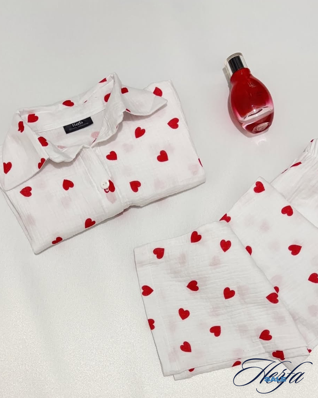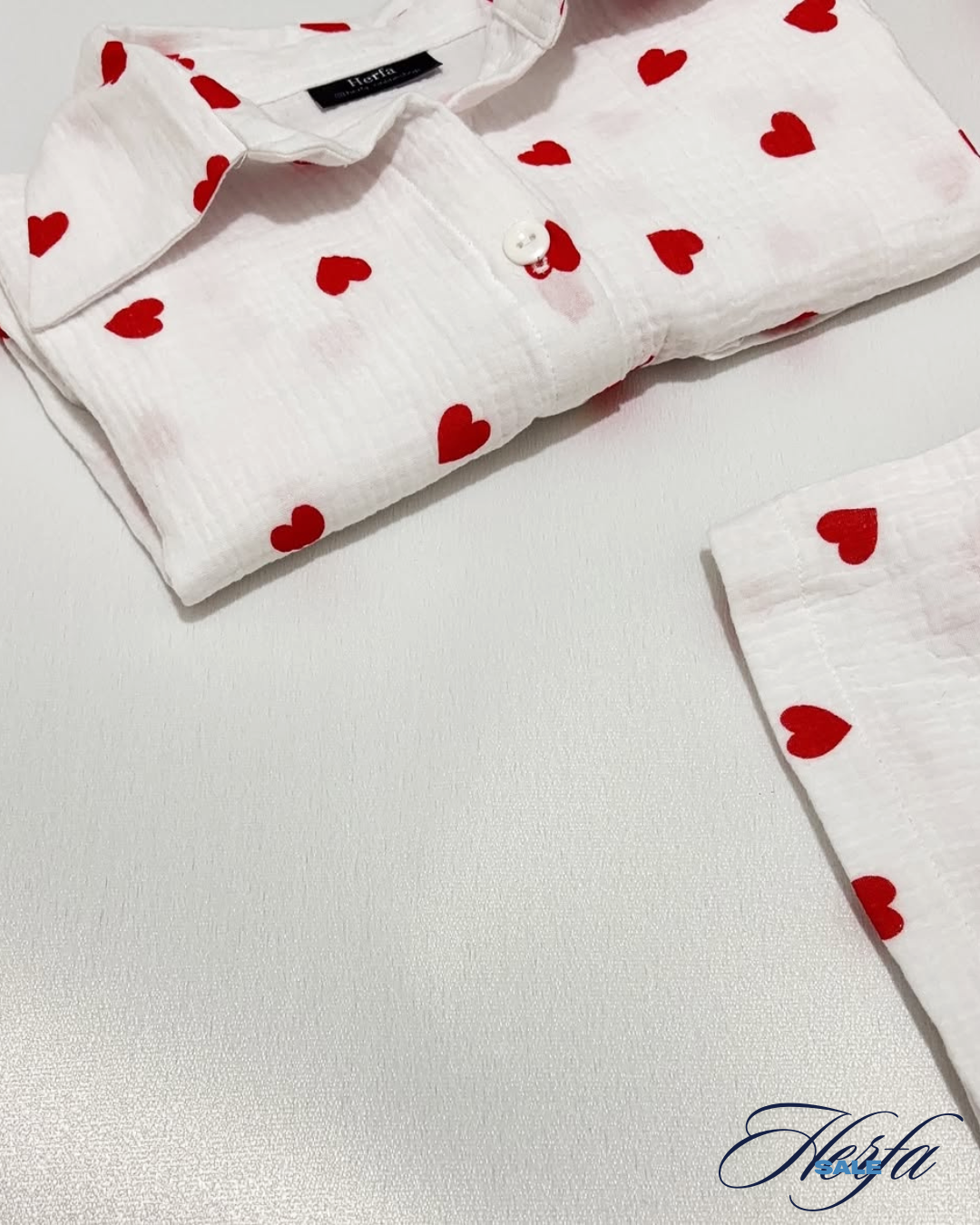 ست بلوز آستین کوتاه و شلوار موسلین مدل heart love با طراحی خاص قلبهای قرمز روی زمینه سفید، انتخابی لطیف، سبک و فوقالعاده راحت برای روزهای گرم سال است. این ست با شلوار بلند و جنس خنک موسلین، برای خواب و استراحت روزمره طراحی شده و با فرم دکمهدار و یقهدارش، همزمان شیک و کاربردی است.